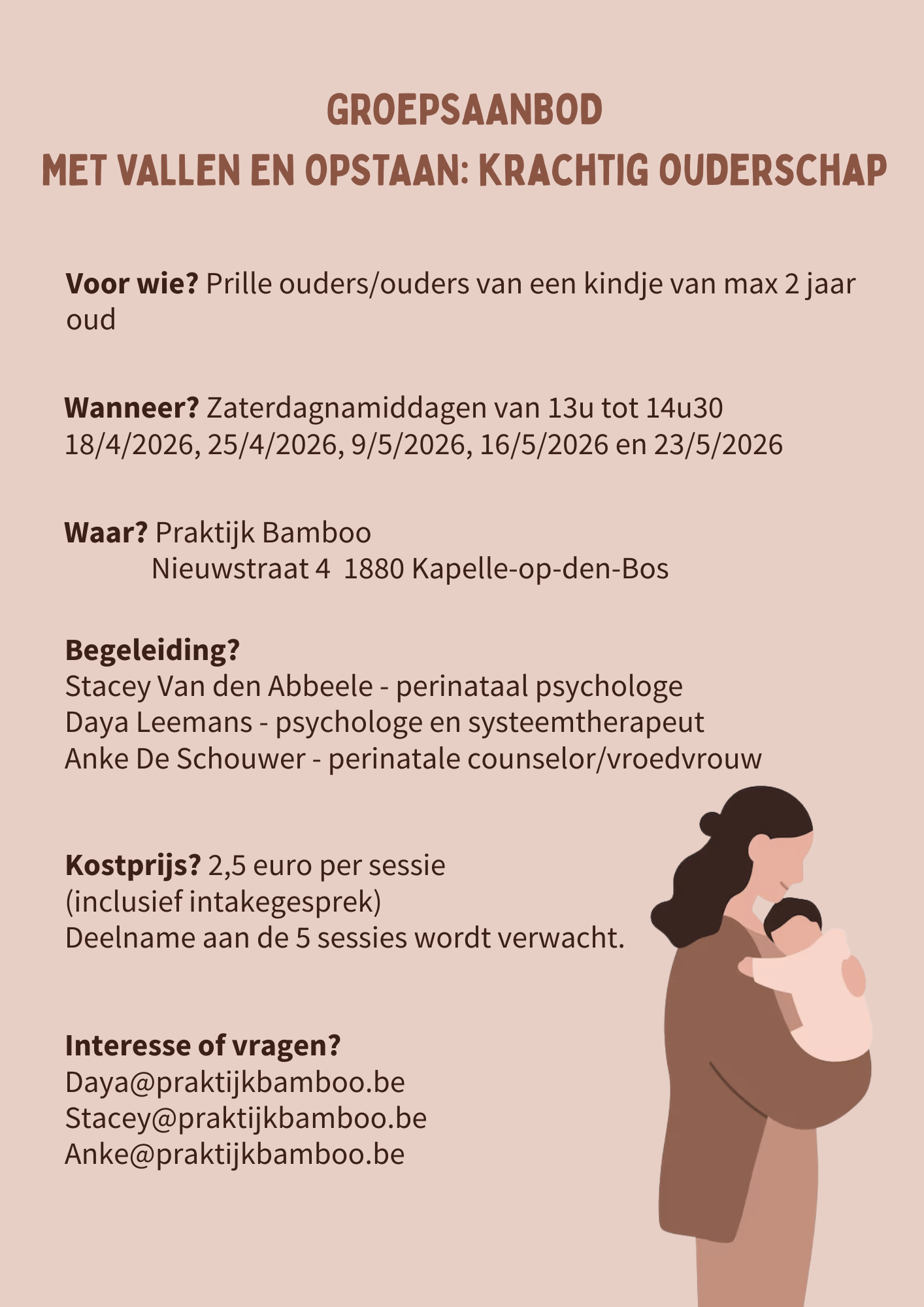 De eerste maanden of jaren met je baby/peuter kunnen zo mooi, maar ook zo pittig zijn. Soms is de roze wolk ver zoek. In kleine groep staan we stil bij volgende thema’s: